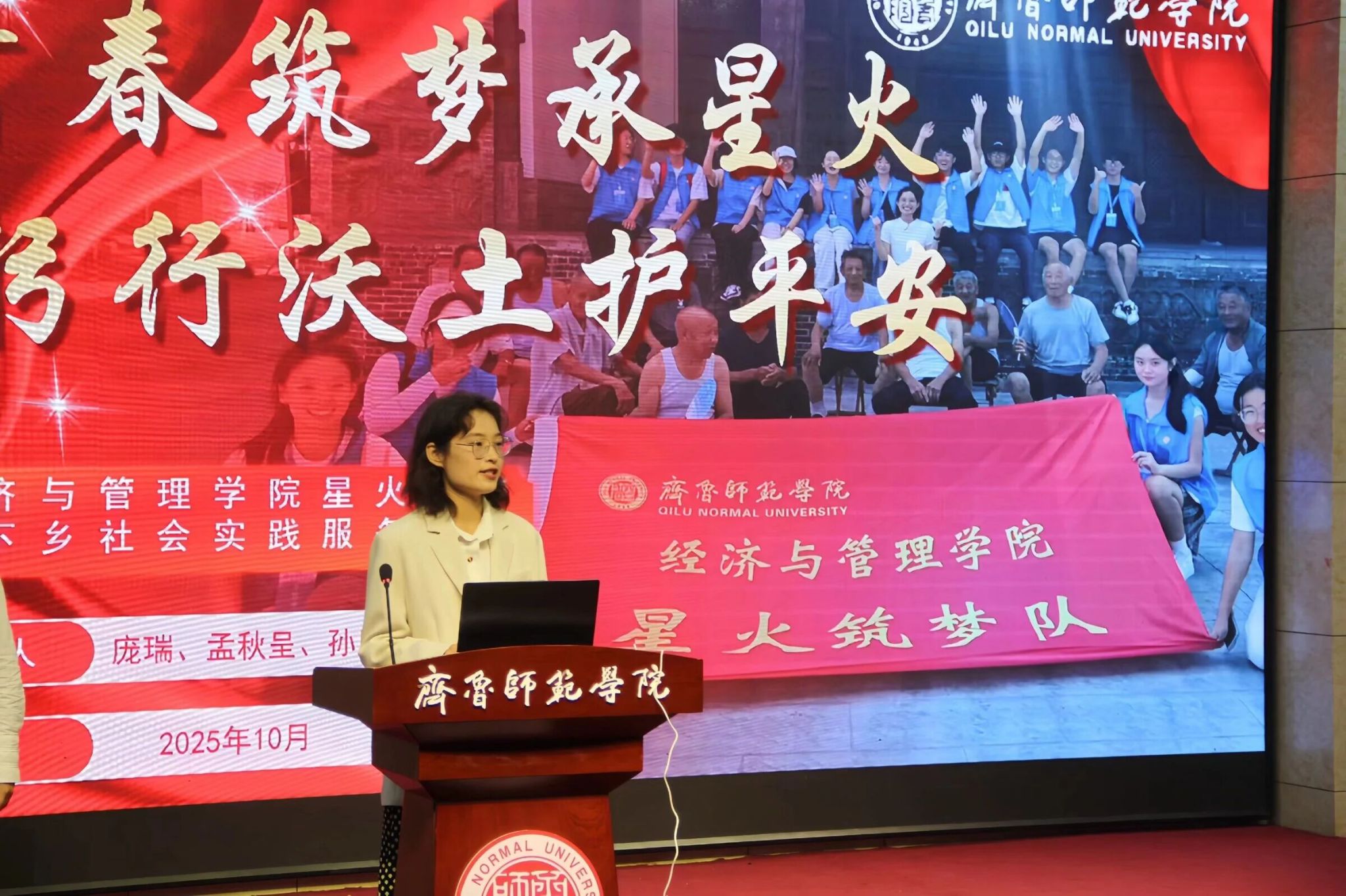 10月14日,2025年大学生志愿者暑期“三下乡”社会实践活动成果展示答辩会在第一学术报告厅顺利举行,经济与管理学院“星火筑梦队”在辅导员庞瑞老师的带领下精彩亮相,以“青春筑梦承星火,躬行沃土护平安”为主题展开汇报,展现了实践中的青春担当。