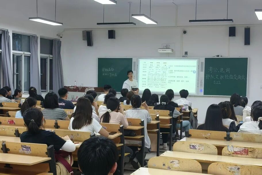 分享会上,宣讲代表为同学们详细介绍了大学生应征入伍的基本条件、优惠政策、发展机遇以及部队生活和退役就业等方面的内容。他特别提到,入伍不仅能获得体能与意志的双重淬炼,退役后在考研加分、考公定向岗位等方面也有政策倾斜,鼓励同学们将个人理想融入国防建设。接着,主讲人为大家展示了自己整理的“信息追踪表”,深度解析了军队文职的招考流程。