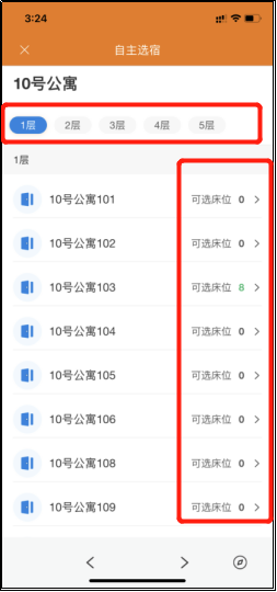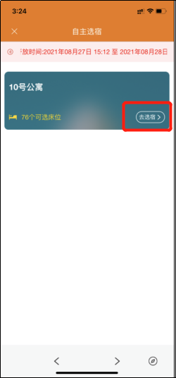 第二步:进入选宿页面后可看到可选宿舍楼展示,点击“去选宿”即可进入该栋宿舍楼内可选择楼层以及各个楼层的具体房间和可选床位数量。