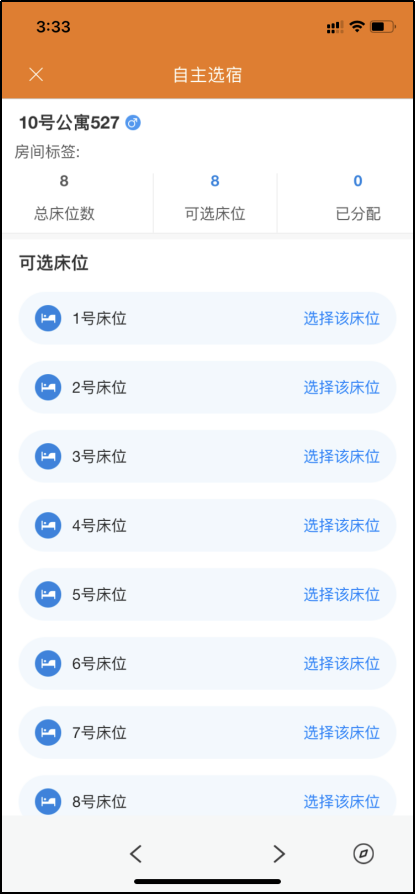 第三步:点击想要选择的宿舍,即可选择床位,并可看到该宿舍已入住人员,点击选择的床位后将会弹出确认提示,确认是否选择该床位,本系统床位选择后将不可更改。
