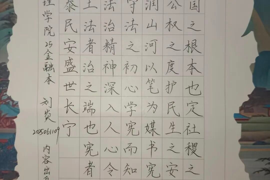 活动启动后,同学们踊跃参与、精心创作,涌现出一大批兼具思想性与艺术性的优秀作品。书法作品中,硬笔刚劲利落、毛笔挥洒自如,同学们以不同书体诠释宪法条文的庄重内涵,笔墨间尽显对宪法精神的理解与敬畏;绘画作品则形式多样,国画笔墨雅致勾勒法治图景,综合绘画色彩鲜明展现法治故事,板绘作品创意新颖诠释宪法理念,每一幅作品都凝聚着师生对宪法的深刻感悟与创作巧思。