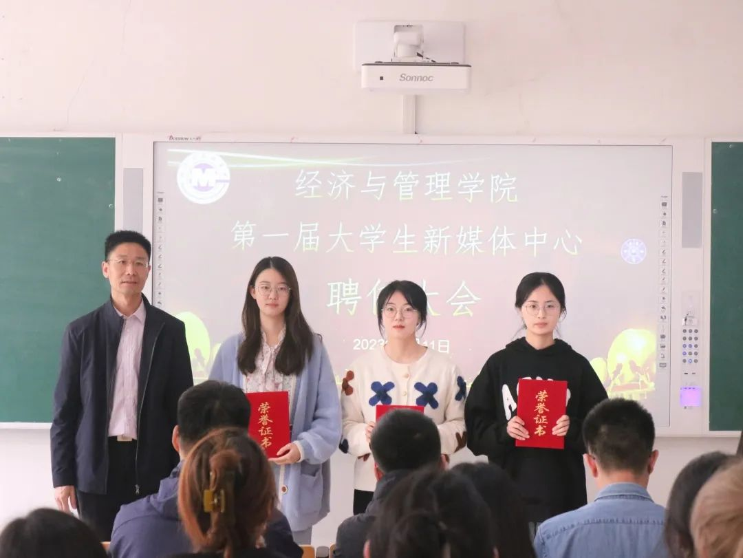 随后,由新媒体中心主席团成员王友菡宣读了第一届大学生新媒体中心人员名单。几位领导老师为新媒体中心主要学生干部颁发聘书。接着,主席团成员张芸慧同学进行聘任发言,对每位新成员的加入表示祝贺,并讲述了自己在新媒体中心的收获与感悟,勉励每一位成员要保持昂扬的心态,不畏将来,继续前行。新生干事代表王虹媛同学发言,表示新媒体中心成员定会保持积极的工作态度,团结一心,共同开创新局面。