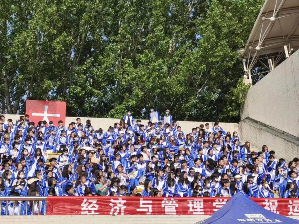 在操场的橡胶跑道上,有着色彩各异的学院——院服与院徽同色的经济与管理学院方队,身着蓝白相间的院服,踏着整齐的步伐,展现出青年人干净利落的精神气质,为运动会开幕式增添了几分青春校园的风采和朝气蓬勃的活力。同学们走在同样的道路上,脚印与脚印重叠,是青春向前的无畏,是青春洋溢的色彩。