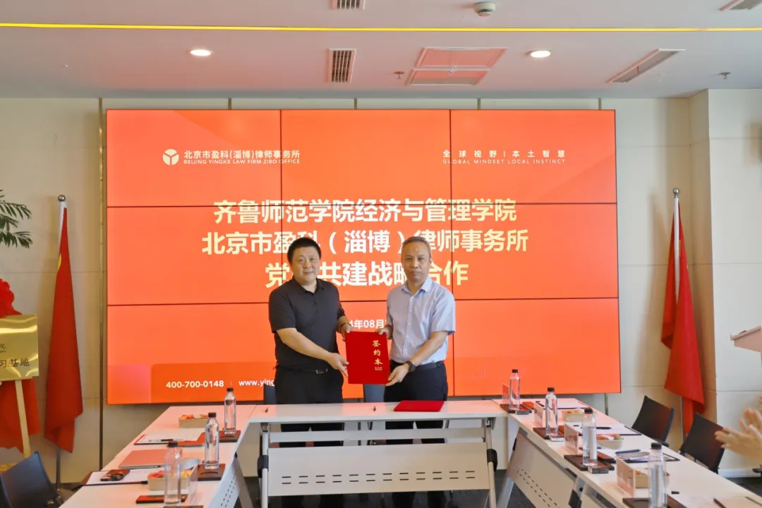 同时,为深入开展业务交流合作及党支部共建工作,我院还同淄博市盈科律师事务所开展党建共建战略合作。齐鲁师范学院经济与管理学院党委书记张帜与盈科淄博律所党支部书记、管委会主任陶志超共同签署党建共建战略协议书,为以后支部间的交流奠定了强有力的基础。