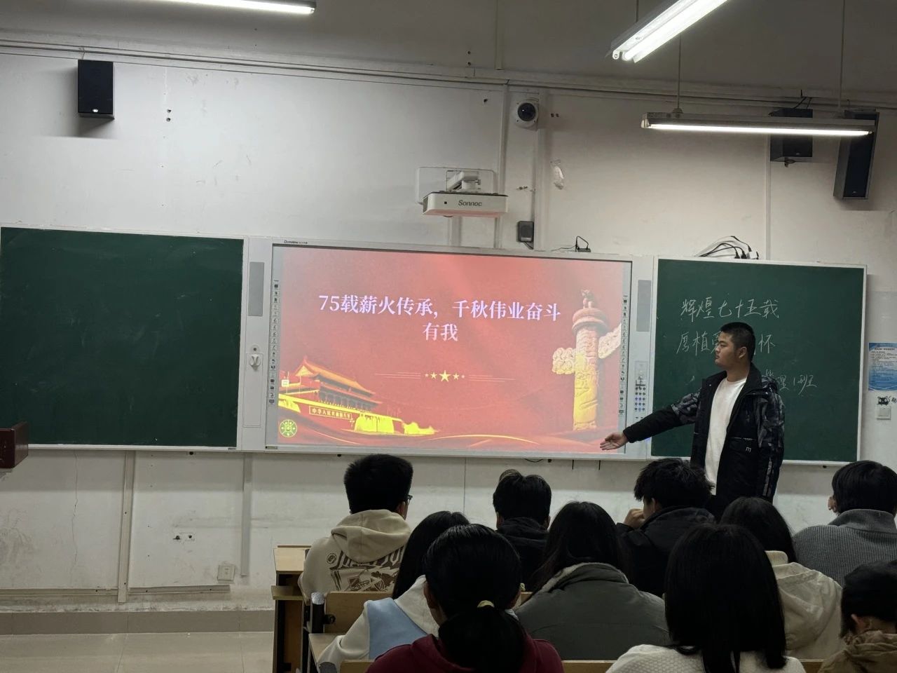 通过此次会议,同学们更加理解了爱国的深意。七十五年的辉煌历程已经过去,但我们的脚步不会停歇。我们将继续努力、继续奋斗,不仅为实现中华民族的伟大复兴而努力,更要为全人类的进步与发展做出我们的贡献。在这个辉煌的时刻,让我们共同祝愿:愿祖国繁荣昌盛,国泰民安!愿我们每一个人都能用智慧与力量共同书写祖国明天更加辉煌的篇章!