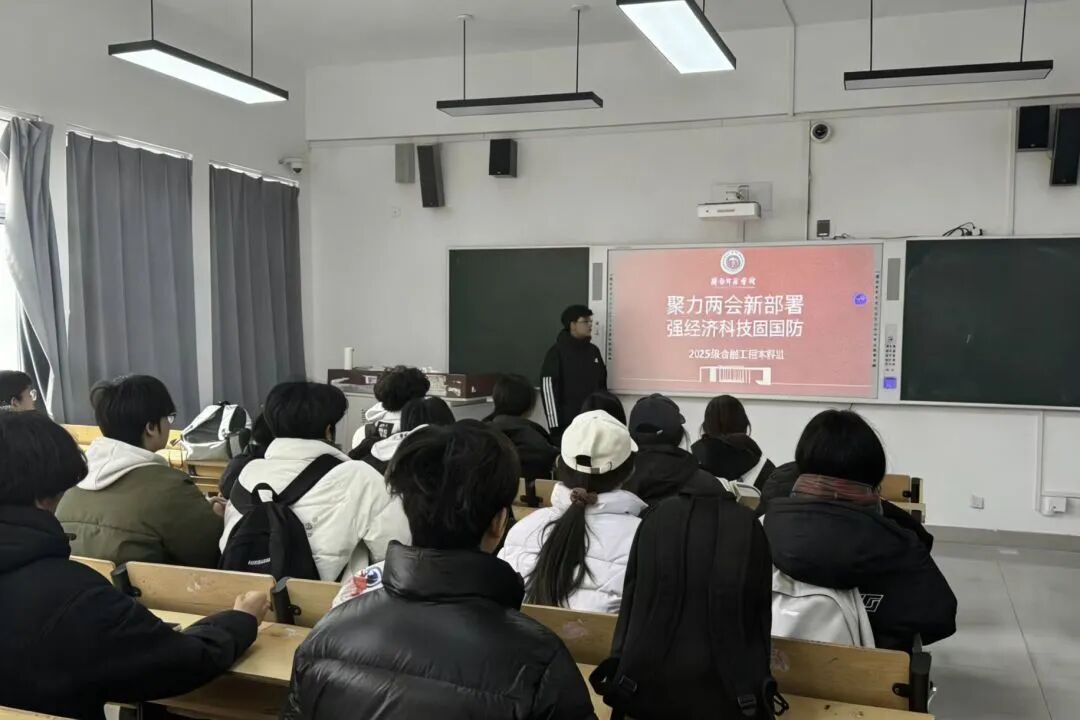 为引导广大学生深入学习领会2026年全国两会精神,我院25级全体同学于3月12日在各班自习教室开展以“聚力两会新部署,强经济科技固国防”为主题的学习活动。本次活动聚焦“十五五”开局之年的宏伟蓝图,旨在让同学们深刻理解强化经济提质增效与推动科技自立自强对于筑牢国家安全根基的时代意义,激励大家将专业所学融入强国伟业。