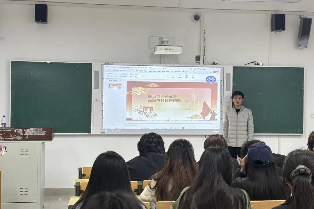 活动伊始,主持人借助详实的政策文件与生动的建设成就,对两会擘画的“经济-科技-国防”协同发展蓝图进行系统解读。从两会设定的更加积极有为的宏观政策,到重点领域超过7万亿元的重大投资布局;从基础研究投入占全社会研发经费比重首次“破7”的历史性突破,到前沿科技的集群式突破;从新域新质作战力量加速规模化实战化发展,到标志性装备的实战化能力跃升,让同学们系统把握住经济高质量发展、科技自立自强与国防现代化建设三者之间深层联动、相互支撑的战略协同关系。