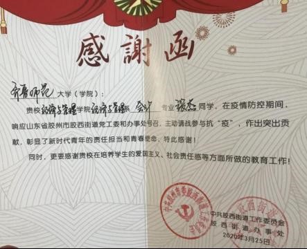 2020年6月,我院收到了来自山东省胶州市胶西街道办事处的一封感谢函。信中表扬了2018级会计专业的张杰同学,在疫情防控期间,响应胶西街道党工委和办事处号召,主动请战参与抗“疫”,做出突出贡献。