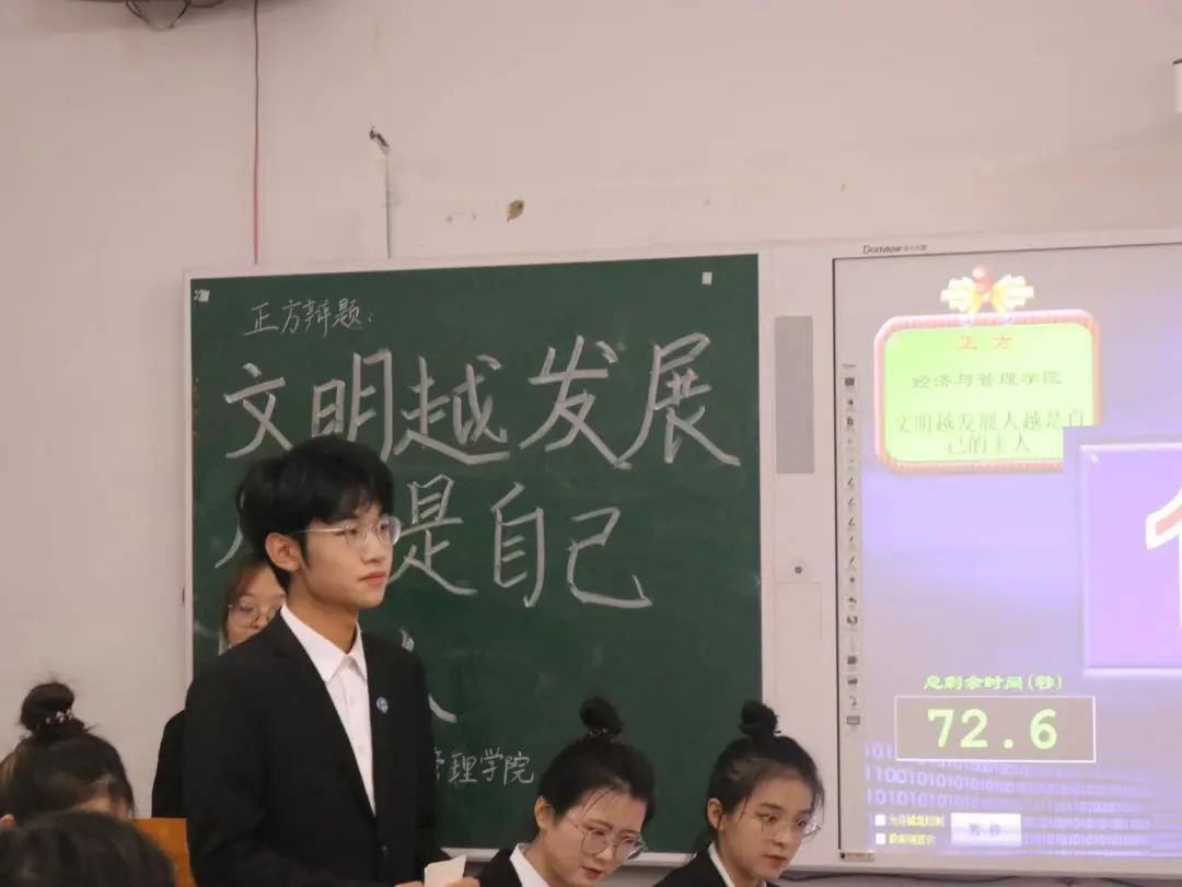 接着在盘问环节,我方二辩围绕本方的辩题提出一系列关于文明发展的问题,一步步证实我方观点,展现出经管辩论队的自信风采,赢得了观众的阵阵掌声。双方三辩对辩,针锋相对,凭借双方的丰富的知识储备,见招拆招,妙语连珠,现场的氛围也随着双方激烈的辩论变得紧张起来,我方三辩从容应对反方的攻势,始终坚持我方辩题。