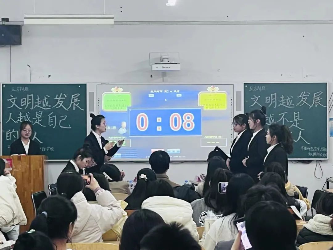 之后四辩总结陈词,双方指出彼此的漏洞。我方四辩再次全面总结我方观点,重申文明越发展,人越能成为自己的主人,越能在不确定的人生中寻找自己的意义。赢得了评委的好评,同时也引发了观众对于自己人生的思考。