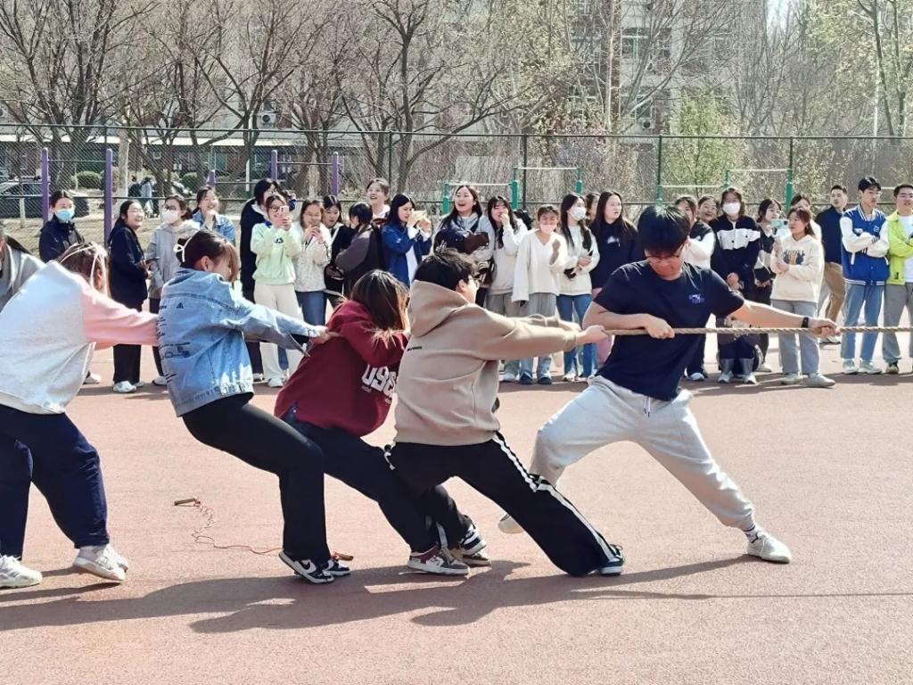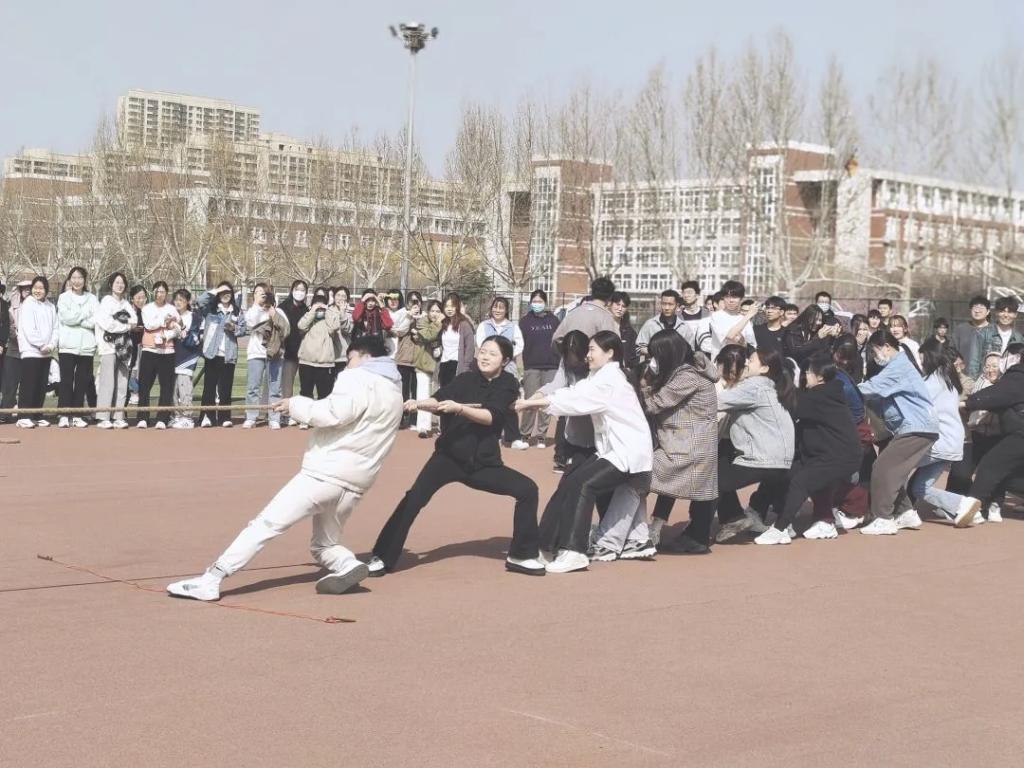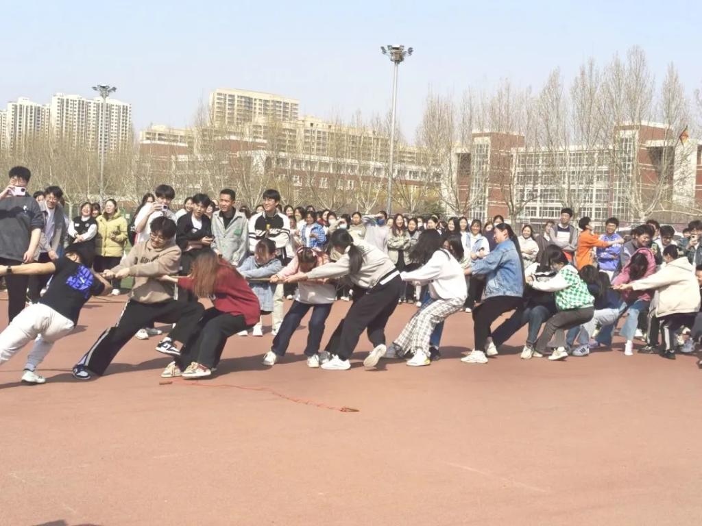 各班级选出16女4男参赛,抽签决定比赛双方,以三局两胜的赛制进行比赛。待裁判员一声令下,参赛人员好似脚下生根,双手卯足了劲的用力拖拽,标志绳在中间摇摆不定,比赛态势进入白热化。周围的同学高声加油助威,为比赛更添了几分朝气蓬勃,神采飞扬的青春热情。