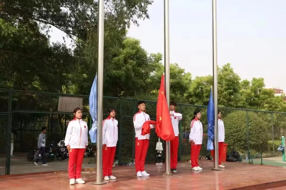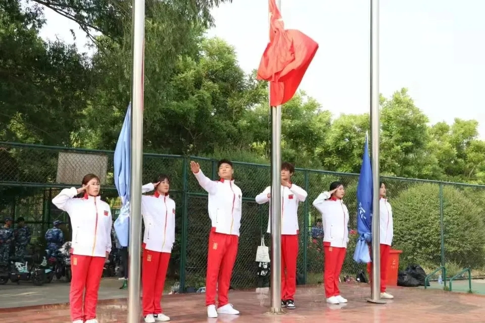 “苦练军事技能,共抒报国情怀”,升国旗,奏唱国歌。同学们注视着国旗缓缓升起,经过这十四天的军训锻炼,同学们对国旗的含义有了更深刻的情感。
