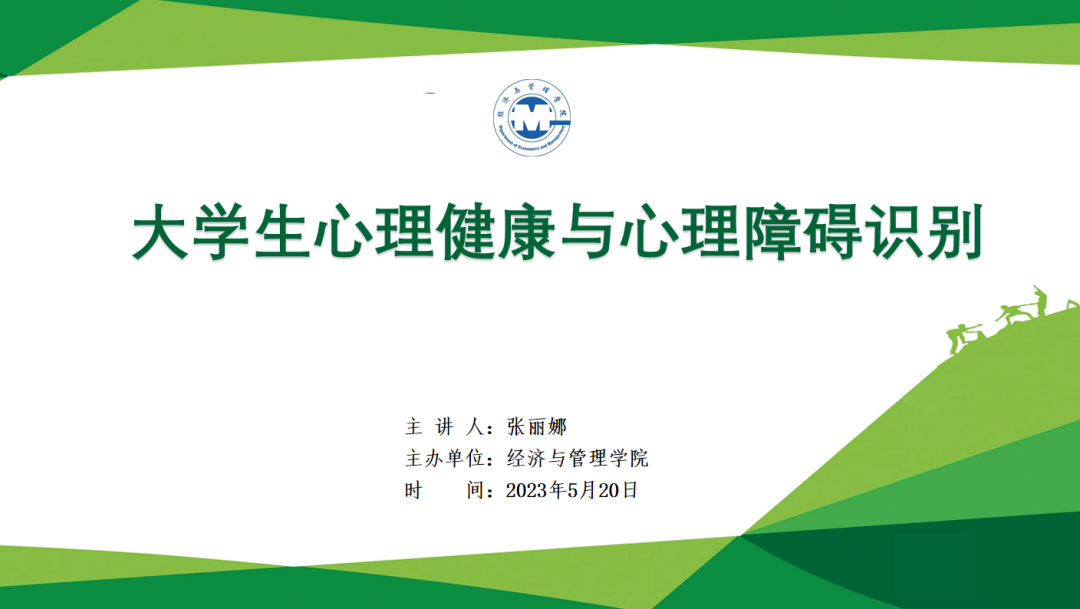 为引导广大师生关注身心健康,普及生理健康知识,进一步让学生了解常见心理问题、不同心理个性的类别,着力提升大学生的心理健康教育,切实增强大学生心理健康水平,在第十三届大学生心理健康教育月期间,我院5月23日晚举办“大学生心理健康与心理障碍识别”专题讲座。讲座由我院辅导员张丽娜分享,学院学生通过线上线下相结合的方式聆听了本场讲座。