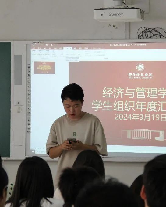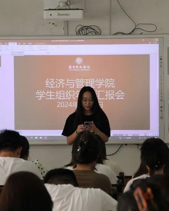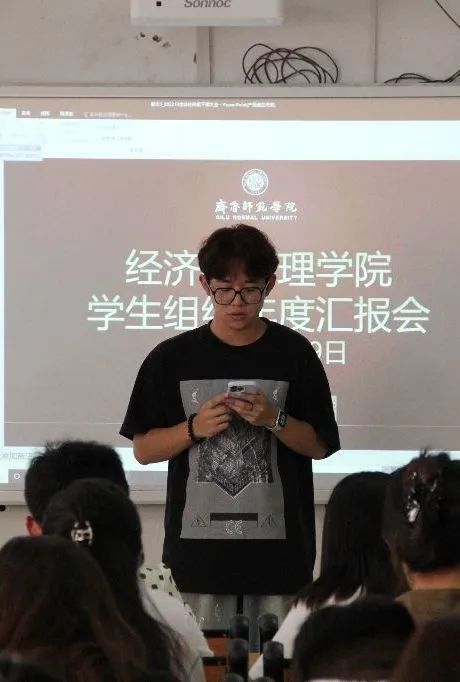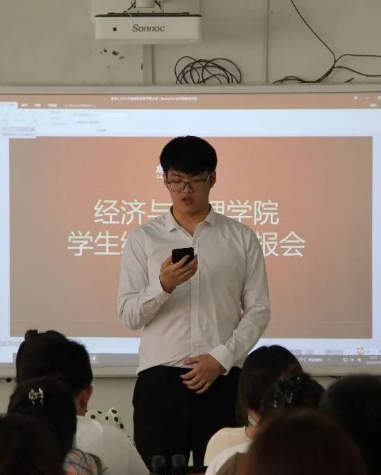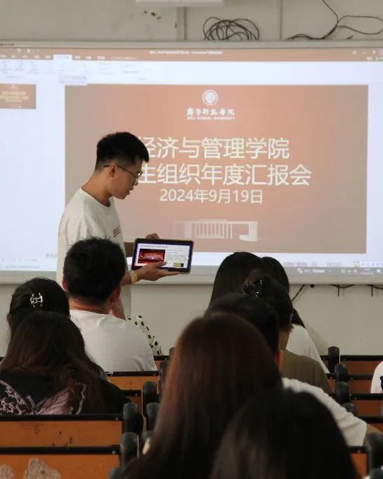 随后,青年志愿者协会开展汇报。青年志愿者协会本学年不仅开展了多项志愿者活动,彰显了经济管理学子积极进取的精神风貌,还定期组织读书会,为广大同学搭建了一个思想交流、阅读分享的平台。与此同时,青年志愿者协会积极配合学院其他各部门组织开展各类活动,确保各项活动能够顺利推进,为保障学生校园生活的丰富性和促进校园文化建设做出了积极贡献。最后,学生会进行工作总结。学生会不仅专注策划开展各项多元化的活动,促进经管学子全方位的成长与进步,更注重整合各成员部门的资源与专业能力,以实现资源的有效共享和优势的相互补充。在强化党团组织建设的同时,学生会也高度重视学生的心理健康状态,积极执行各项评奖事宜,加强学风建设,营造学院浓厚的学习氛围。