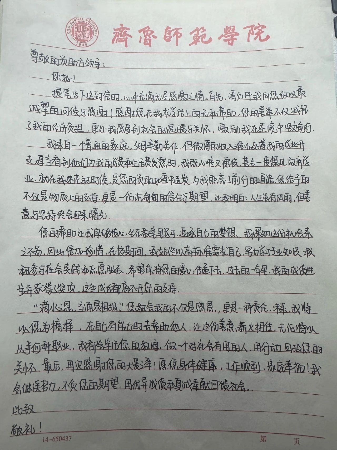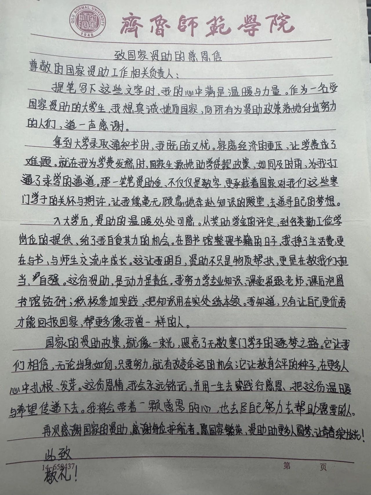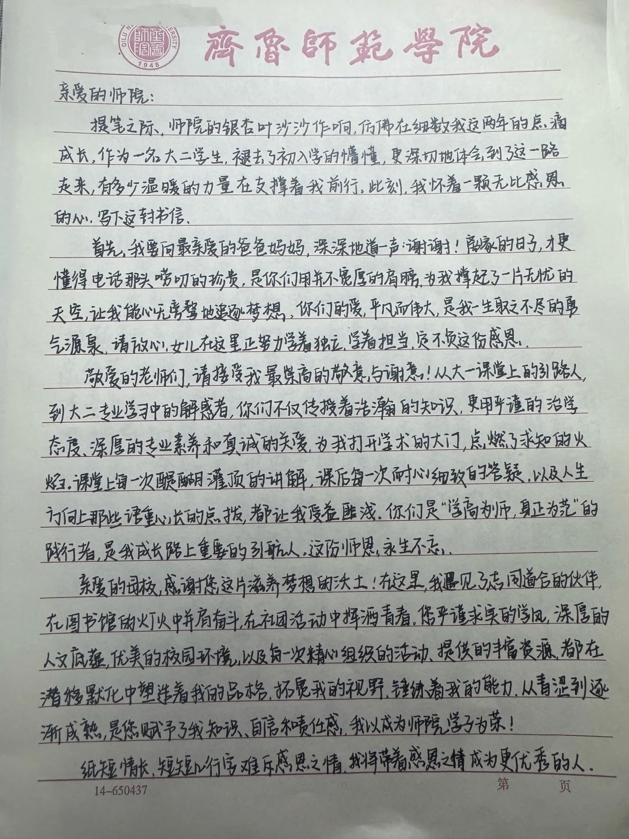 本次活动以 “感恩” 为锚点,号召学生以书信为舟,向父母、师长、学校及社会各界倾诉拳拳谢意。活动启动后,迅速在全院激起共鸣,同学们纷纷执笔,将感恩之情凝于笔端,落于纸面。字里行间,是对父母养育之恩的深情告白:“您鬓角悄然染上的霜花,是岁月镌刻的爱的勋章”;是对师长教诲之恩的诚挚谢意:“您每一次的鼓励,都如星芒点亮我逐梦的方向”;更是受助学生对国家资助政策、社会爱心人士的肺腑感恩:“是你们的善意,赋予我奔赴梦想的底气”。学生们以细腻笔触回溯成长,用质朴文字传递感恩温度,让一封封书信,成为情感流淌的载体,织就温暖的网。