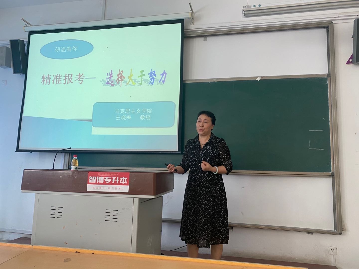为着力提升学生考研质量与结构,引导学生做出更明确的考研规划,让学生有计划、有针对性地复习,7月10日下午14:00,我院邀请马克思主义学院党总支书记王晓梅为2017级学生进行了一场“干货”十足的考研讲座。
