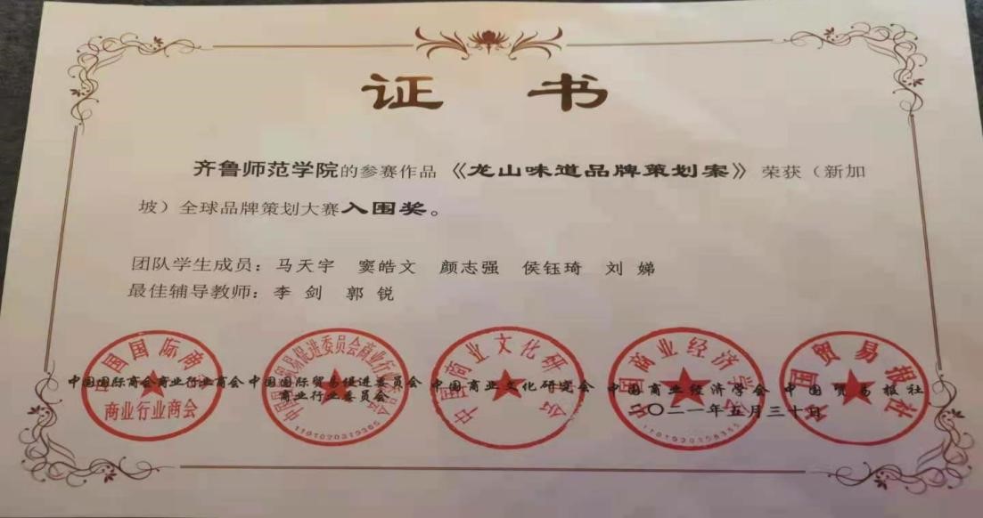 在学校各级领导、特别是教务处领导大力支持下,经过三个多月的精心准备,经济与管理学院组织的两个参赛团队代表齐鲁师范学院在大赛中脱颖而出,首次获得全国级学科竞赛一等奖一项、全国二等奖一项、最佳创意奖两项。其中荣获全国一等奖的作品《龙山味道品牌策划案》获得代表中国大陆地区参加全球品牌策划大赛总决赛的资格。