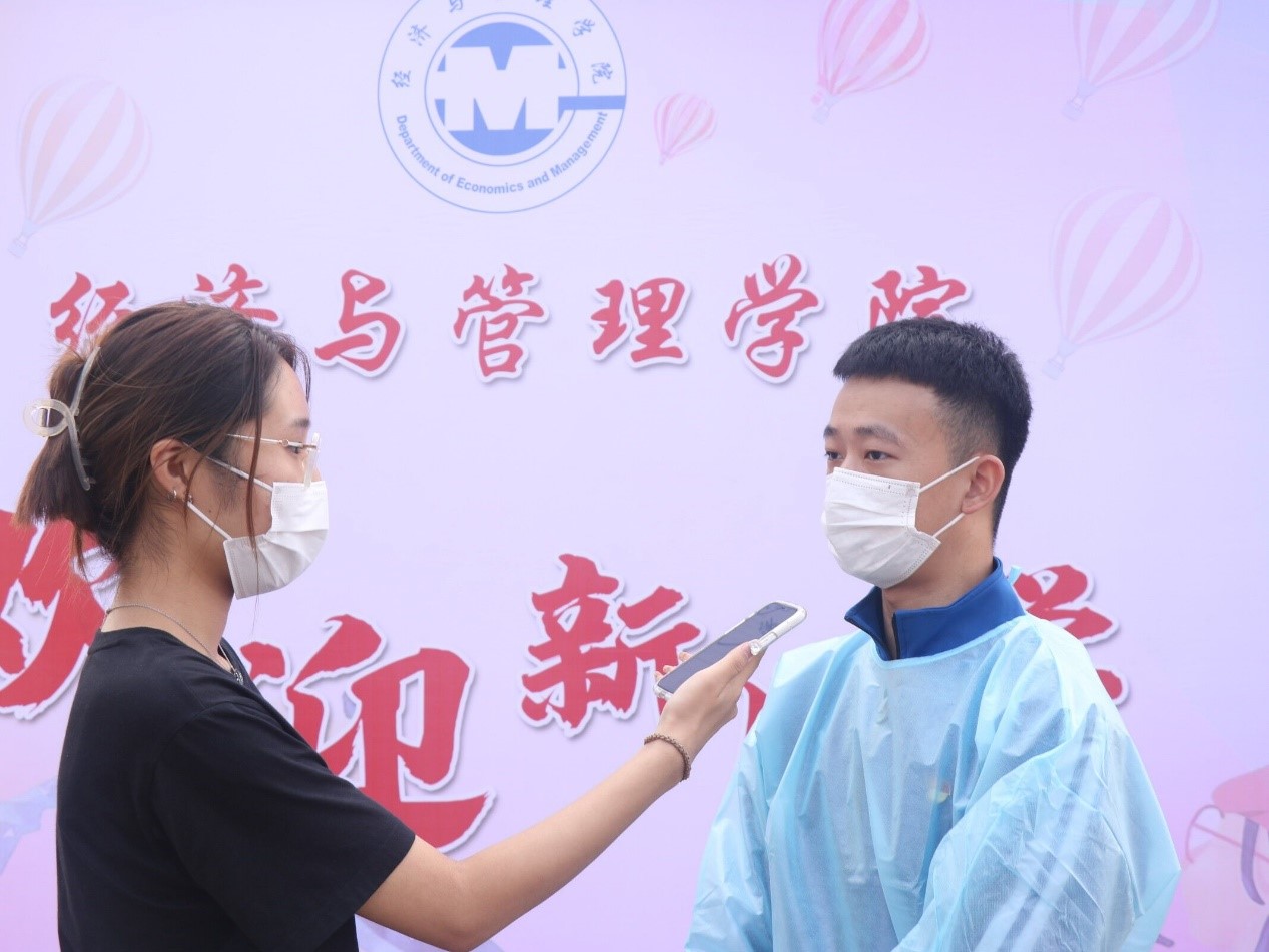 报到现场,文化长廊上拉满横幅。“经纶三载,惟吾德馨,管藏天下,伴尔同行”的标识激励着每一位新同学。完成入学流程后,志愿者协助并带领省外新生前往隔离宿舍楼,志愿者以热情饱满的姿态给予每一位离乡别土的少年温暖与归属之感。来自贵州的胡严心同学表示,在报到过程中充分感受到了经管学院这个大家庭带来的温暖与热情,相信在未来的大学生活中,定能实现自己的梦想。省外新生在隔离宿舍完成入住后,经济与管理学院党员志愿者与省外新生进行点对点服务。经济与管理学院2019级学生党员唐铭辰表示,身为志愿者是一件非常荣幸的事情,希望大一新生可以在经管学院茁壮成长,收获一个快乐的大学生活。