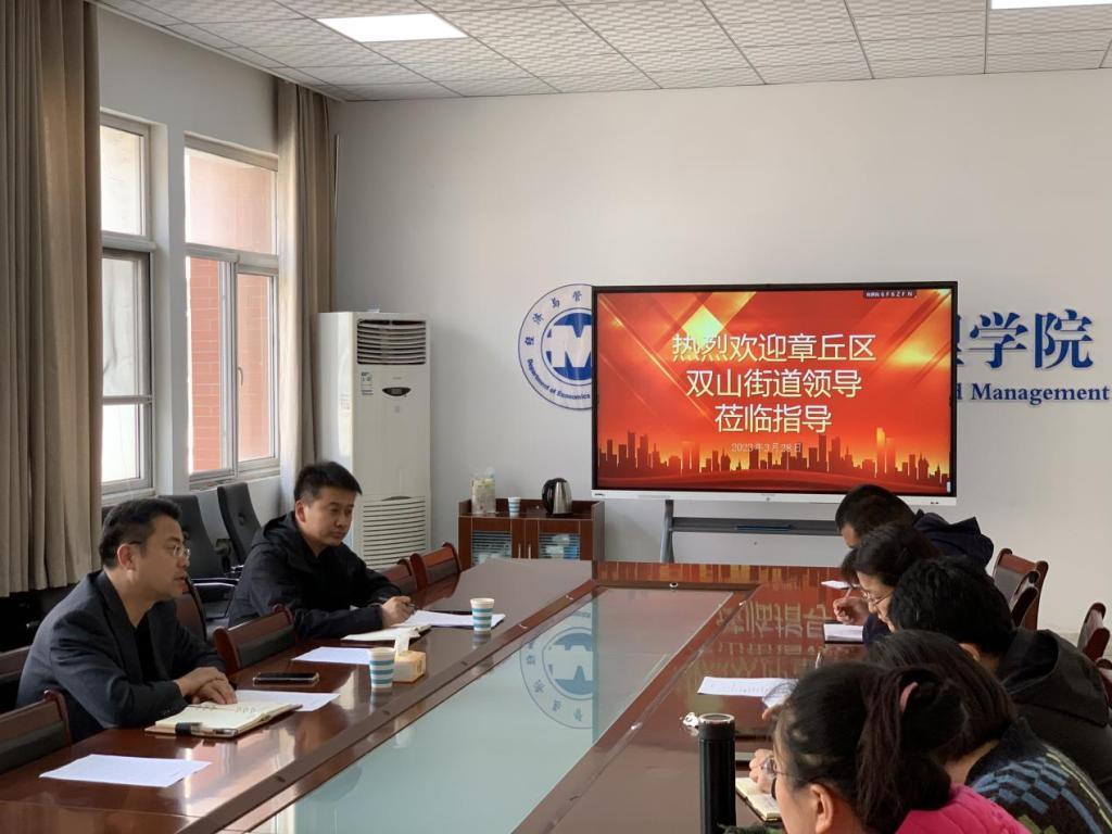 3月28日下午,章丘区双山街道办事处主任张鹏和副主任王康到我院洽谈合作,院长蔡平、金融工程教研室主任徐光博士、钟琦博士、黄晋生博士等参加了会议。