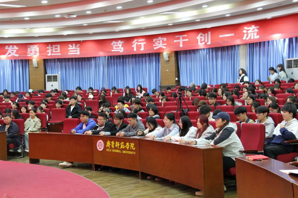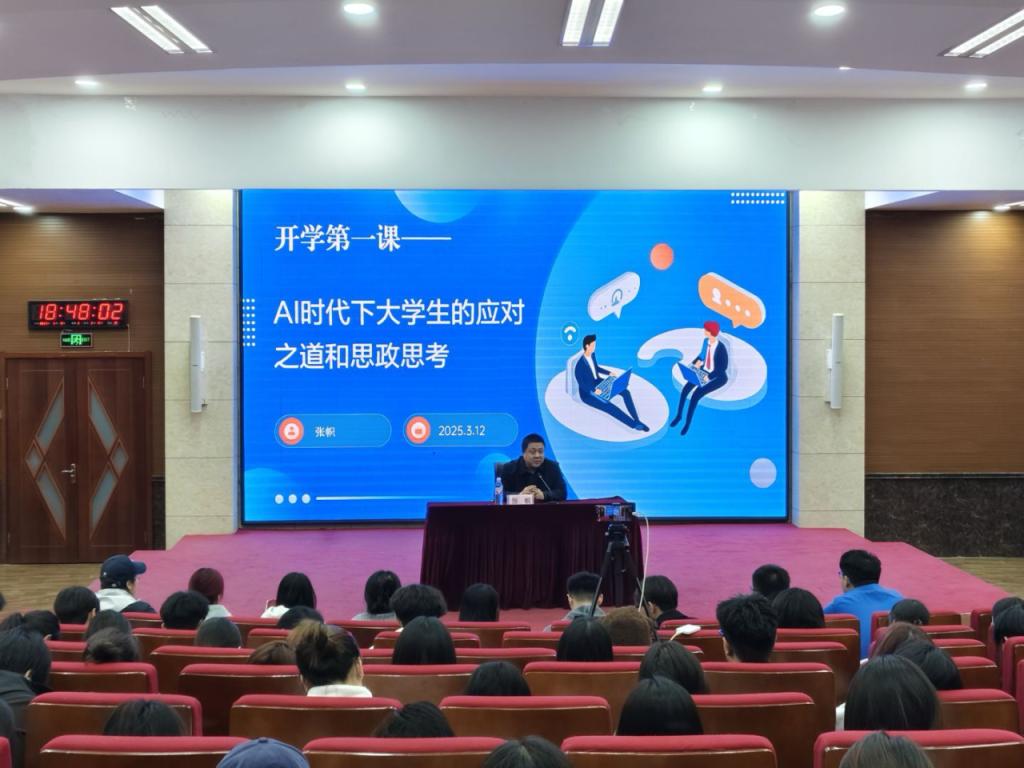 为激励学生在赓续奋斗中厚植爱国之情、砥砺强国之志、实践报国之行,经济与管理学院于3月12日18:30在图书馆第一学术报告厅开展以“青春启航,筑梦未来——新时代大学生成长成才的思考与路径”和“AI时代下大学生的应对之道和思政思考”为主题的“开学第一课”。同时,在一教b208、b212教室开设分会场。出席本次讲座的有院长周健、党委书记张帜、经济与管理学院学生干部和24级全体同学。