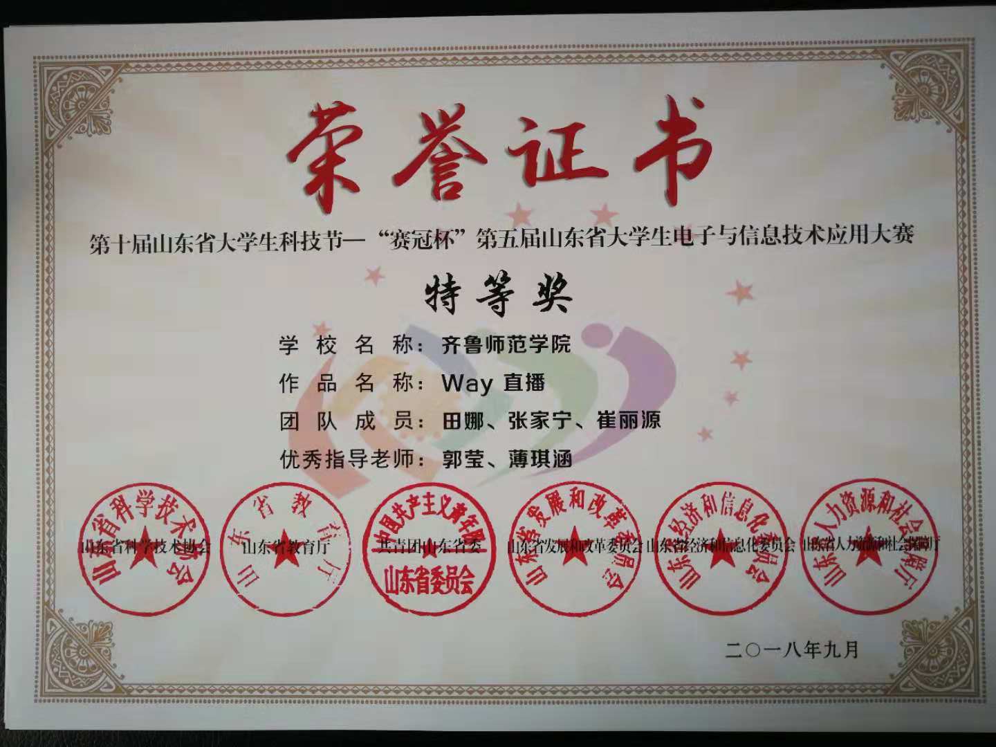 近日,由山东省教育厅、山东省科学技术协会、共青团山东省委、山东省发展和改革委员会、山东省经济和信息化委员会、山东省人力资源与社会保障厅等六部门共同主办的“第五届山东省大学生电子与信息技术应用大赛”总决赛颁奖典礼在泰安隆重举行,我校经济与管理学院参赛的电子商务运营项目—“Way直播”(团队成员:张家宁、崔丽源、田娜 指导教师:郭莹、薄琪涵)荣获省“特等奖”。