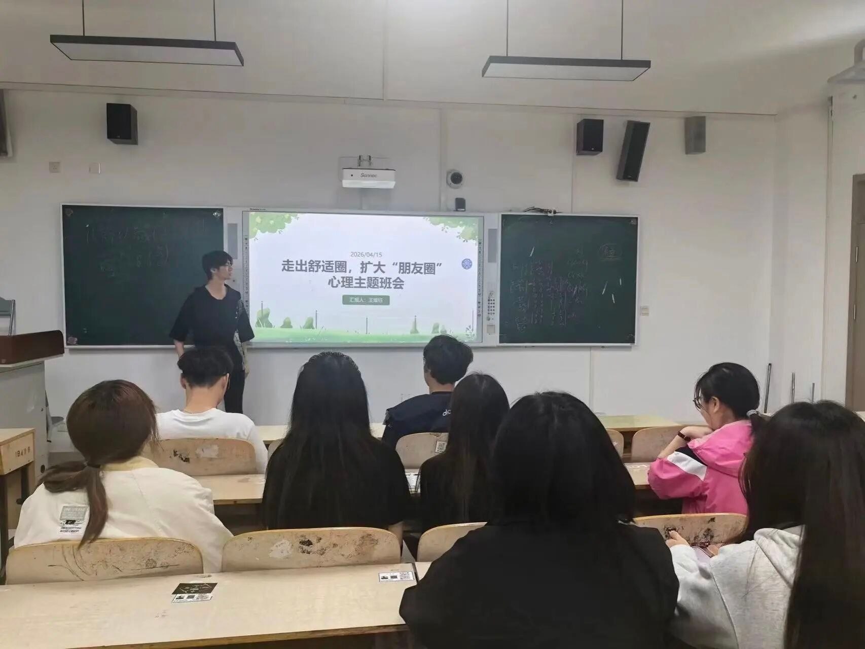 为引导同学们打破社交局限,勇敢走出个人舒适区,以开放自信的心态融入集体生活,我院生活心理部于4月15日晚自习时段,在一号教学楼各班级晚自习教室开展了以 “走出舒适圈,扩大我的‘朋友圈’” 为主题的心理班会。